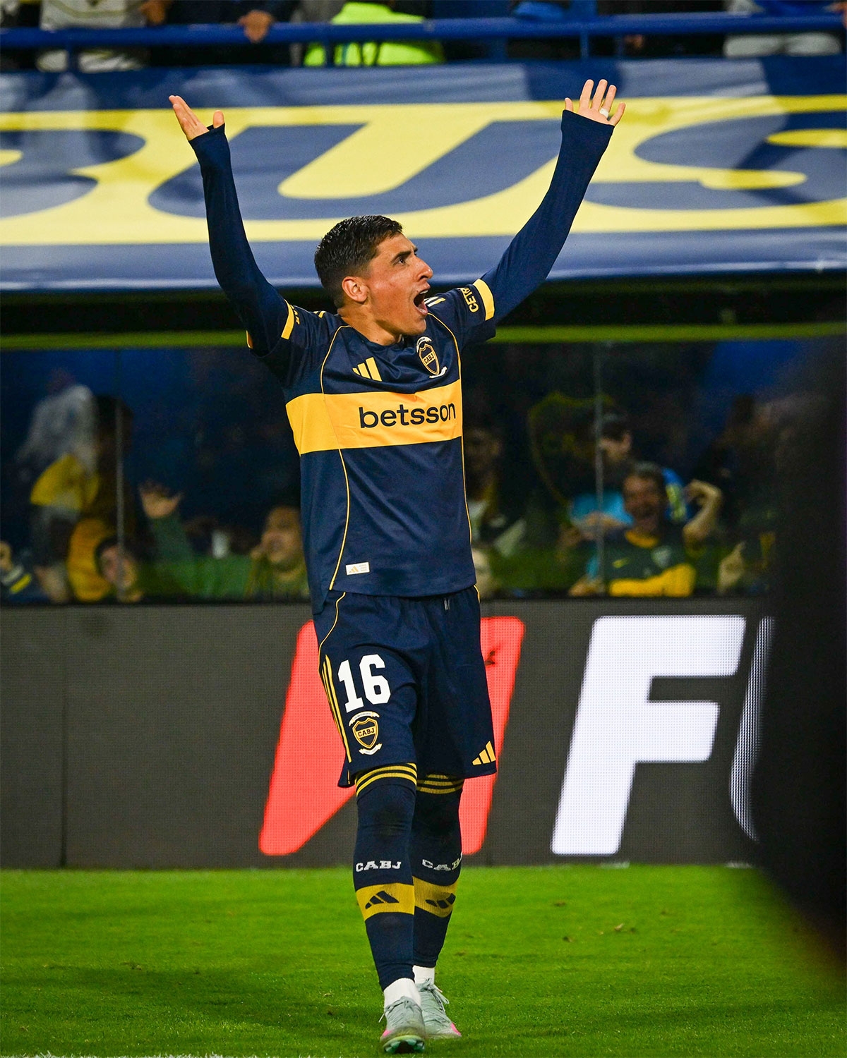 La primera alegría de la noche para Boca llegó cuando Paredes ejecutó un tiro de esquina, ganó en lo alto Lautaro Di Lollo, la pelota dio en el travesaño y Miguel Merentiel sólo tuvo que empujarla de cabeza.