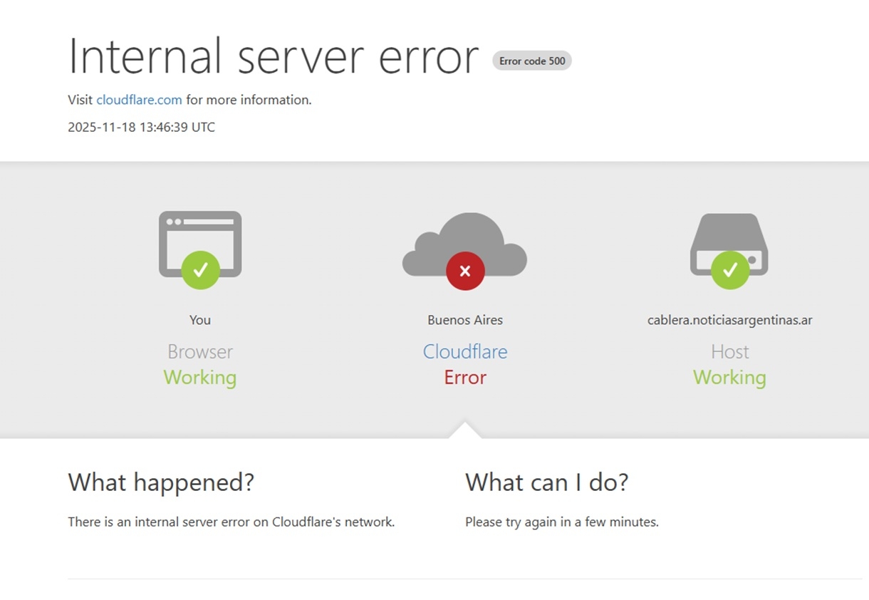 Al intentar ingresar a las páginas, los navegadores devuelven mensajes de "500 Internal Server Error" o "502 Bad Gateway", indicando que los servidores no pueden responder a las solicitudes. Cloudflare confirmó que está "investigando el incidente" y trabaja en una solución para restablecer el tráfico.