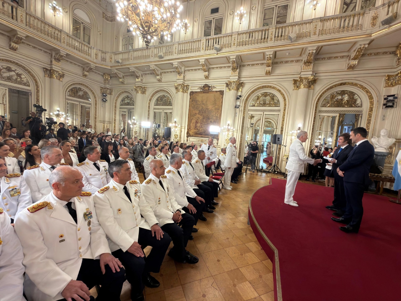 Tras recibir la condecoración que formaliza el ascenso en el Salón Blanco de Casa Rosada, el futuro ministro de Defensa desfiló por el primer piso del Palacio de Gobierno para reunirse con el asesor presidencial, Santiago Caputo, en los despachos que tiene en el primer piso.