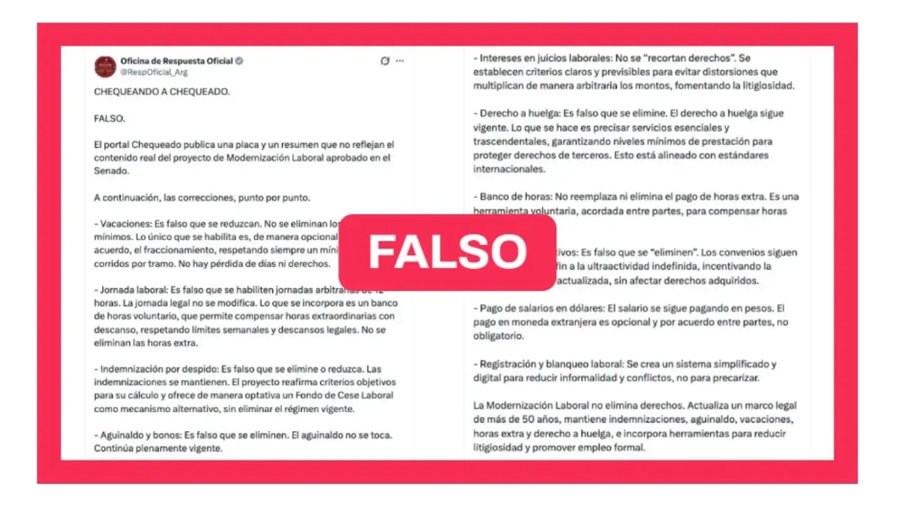 Chequeado, la organización sin fines de lucro que se dedica a verificar con datos las noticias de la agenda argentina, dijo que la flamante Oficina de Respuesta Oficial del gobierno de Javier Milei respondió con desinformación una infografía sobre la reforma laboral.