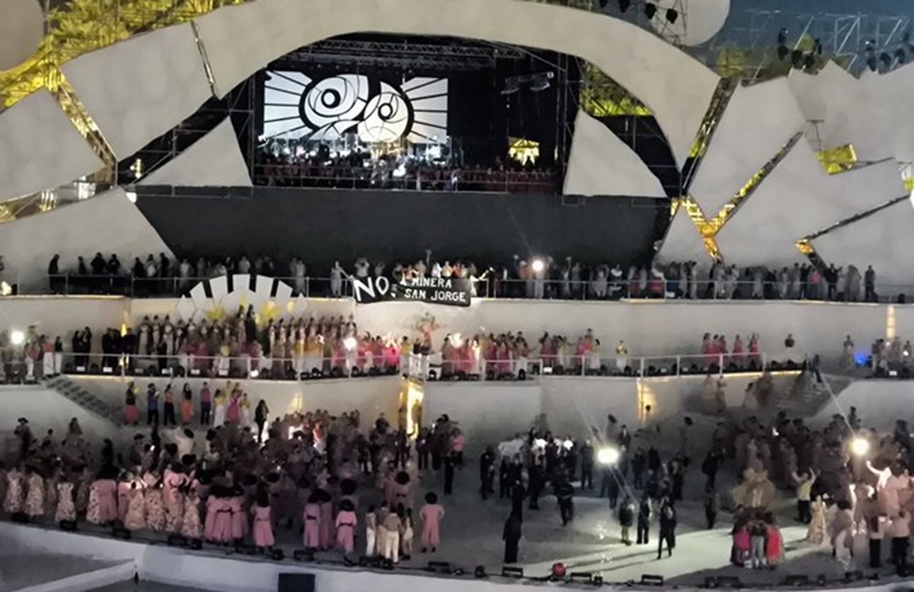 La intención del gobierno provincial de esconder los reclamos contra la minería han alcanzado niveles impensados. Este fin de semana se confirmó que el Ejecutivo ordenó hacer modificaciones en el guion de la Fiesta Nacional de la Vendimia para evitar que se destaque la importancia del agua y los ríos. En su lugar, tras el cambio, el guion habló de "tierra" y "surcos". Pero a pesar de los esfuerzos del Ejecutivo, un grupo de artistas logró ingresar una bandera contra la minera San Jorge y fue desplegada en el escenario principal.