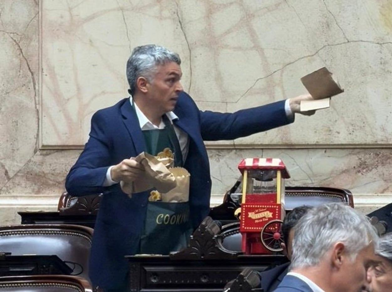 En respuesta a eso, el diputado del socialismo santafesino dio la nota al entrar al recinto con un delantal y la máquina de hacer pochoclos, y se prestó a sacarse fotografías y repartir pochoclos a muchos de sus colegas de la oposición.