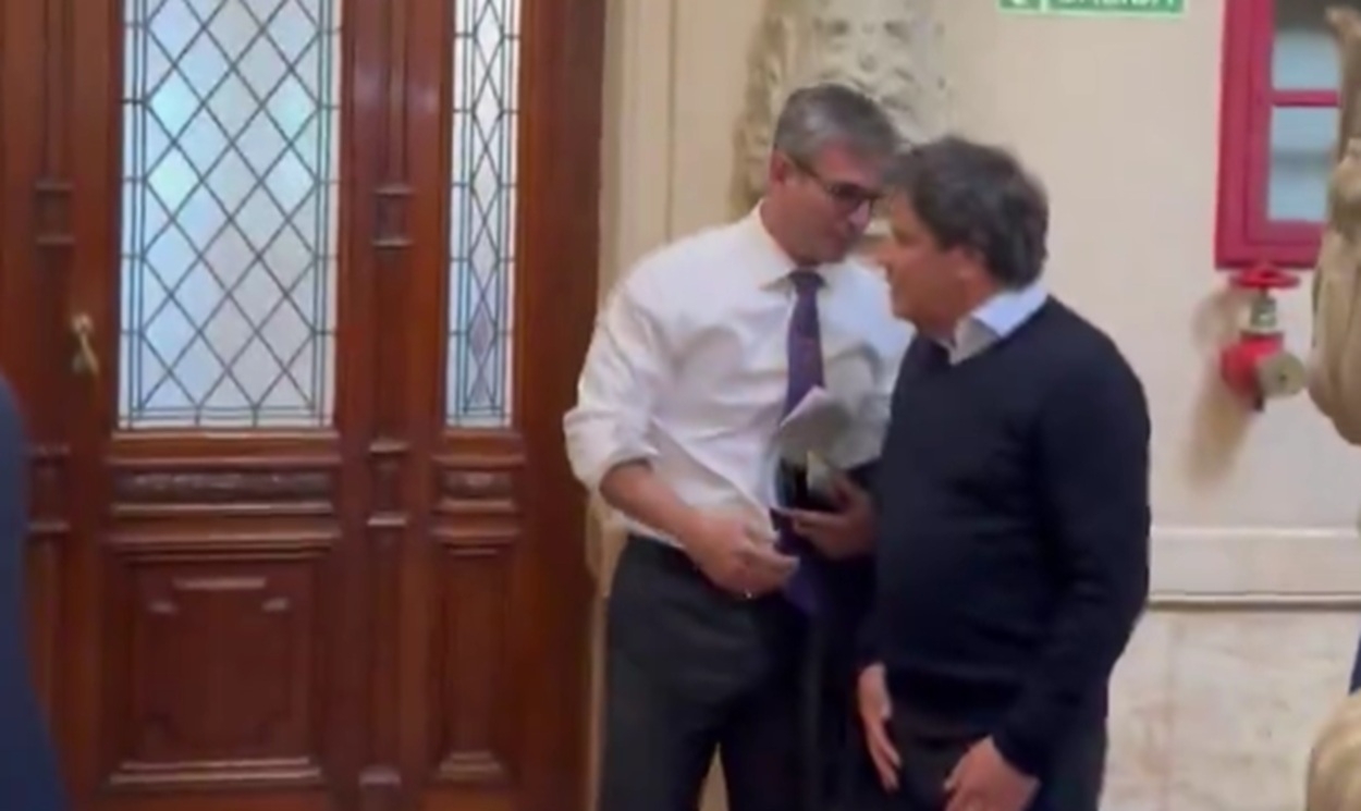 En el video, ambos dirigentes políticos se saludan con amabilidad en un muy breve cruce y siguen de largo, y no hubo tiempo para que el titular de Diputados le dijera todo lo que denunció Manes.