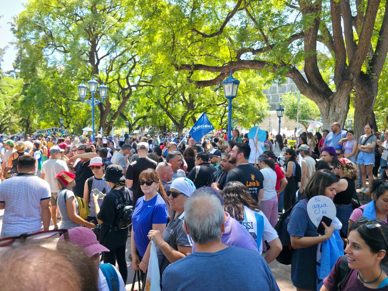 Miles de manifestantes de toda Mendoza convergieron este martes en la Plaza Independencia, llevando adelante una protesta para intentar frenar la inminente sanción de cuatro proyectos mineros en la Legislatura, que se desarrolla bajo un importante despliegue policial que comenzó el lunes.