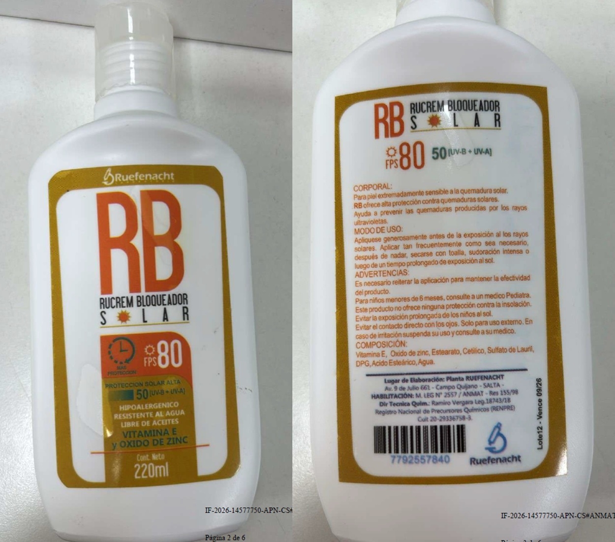 Además, en la disposición de la ANMAT se señala que el otro producto es “RUCREM BLOQUEADOR SOLAR RB FPS 80”, un protector solar destinado a pieles extremadamente sensibles del cual el organismo verificó que no existían antecedentes de habilitación del laboratorio para el rubro cosmético y que el número de legajo informado pertenecía a otro establecimiento.
