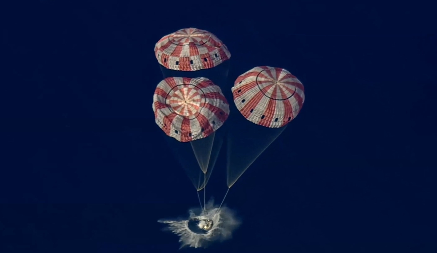 Tras salir del estado de oscuridad, la cápsula Orión se desprendió de la cubierta de su compartimento delantero, desplegó sus paracaídas de frenado cerca de los 22.000 pies, y a continuación, desplegó sus tres paracaídas principales alrededor de los 6.000 pies para reducir la velocidad.