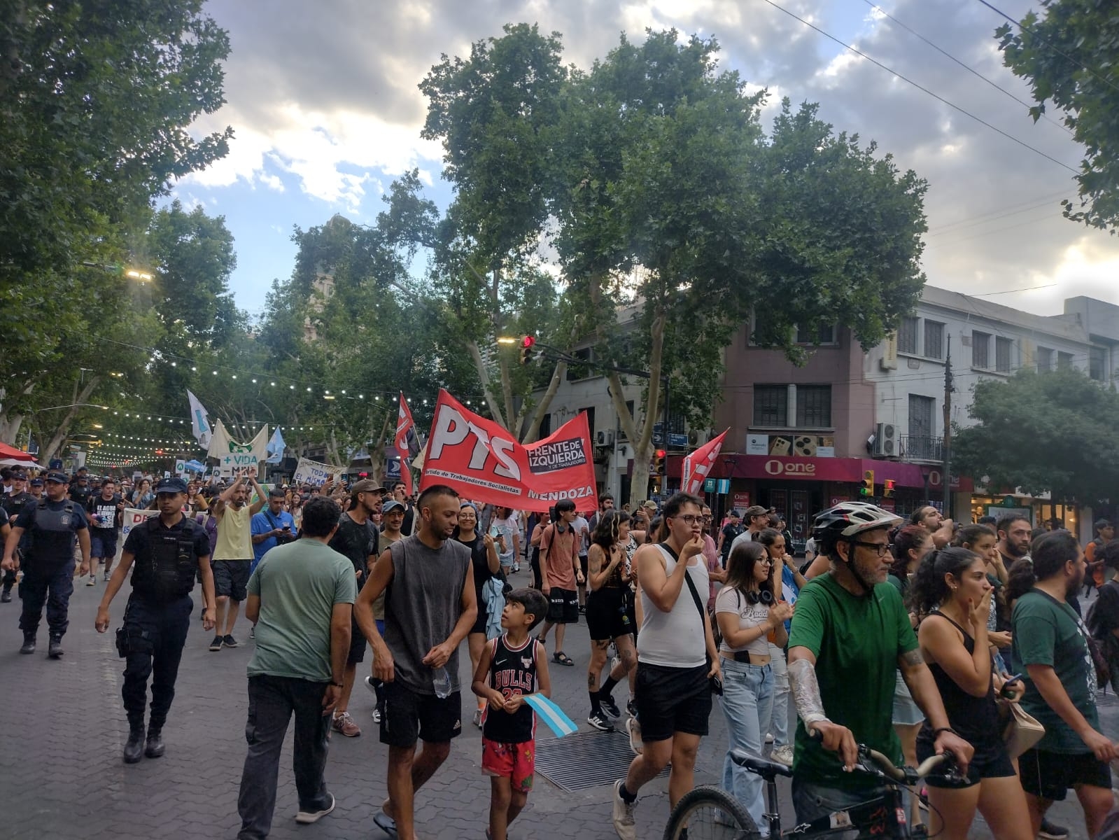 Minutos después de las 20 los manifestantes en contra del Proyecto San Jorge tomaron la calle San Martín y con una fila de policías que los “escoltaba” a cada lado comenzaron a caminar por la avenida principal de la Ciudad de Mendoza.