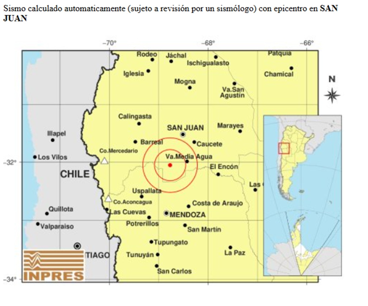 Según informó el Instituto Nacional de Prevención Sísmica (INPRES), el temblor tuvo epicentro a 35 kilómetros al Sur de San Juan, 91 kilómetros al Norte de Mendoza y a 34 kilómetros al Oeste de Media Agua.