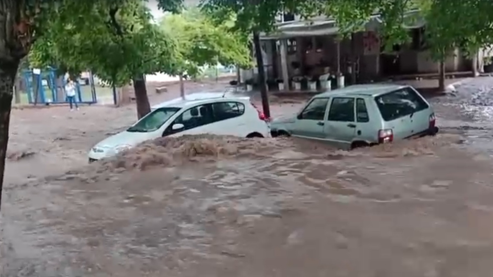 En Luján de Cuyo la calle Anchorena se convirtió en un río y el agua arrastró a dos autos. Un Fiat Punto blanco comenzó a deslizarse por el agua y en el camino golpeó a un Fiat Uno gris.