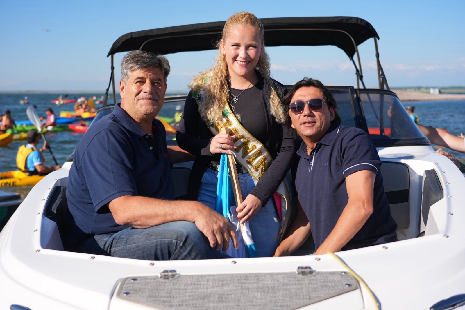 En la foto se lo puede ver a bordo de una embarcación con la reina vendimial de Junín y el concejal Mario Ana en el marcp de una nueva edición del Triatlón Aniversario de Junín. Según las autoridades, Abed no será multado porque la foto fue tomada en la orilla del espejo de agua.
