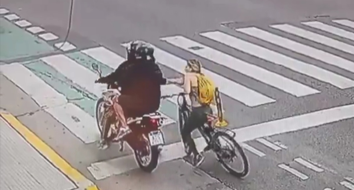 El incidente quedó registrado por las cámaras de seguridad públicas y las imágenes plasman el momento en que la turista consigue atrapar a uno de los motochorros, luego otros vecinos se suman para ayudar a reducirlo y lo comienzan a golpear.