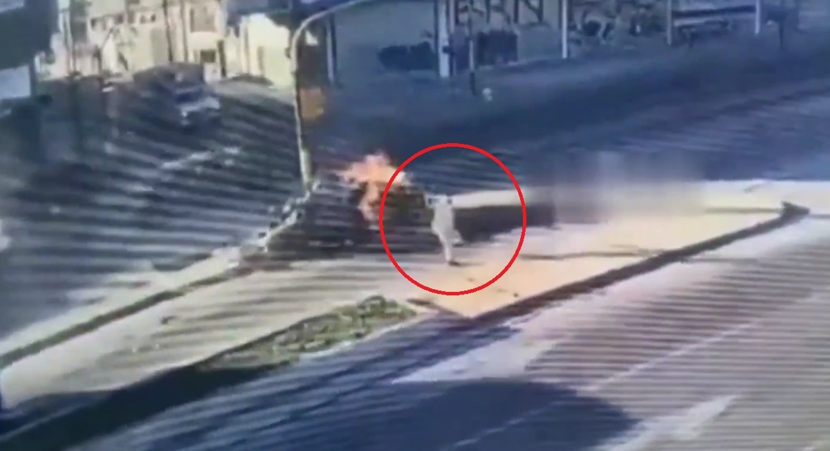 Video: cinco hombres salen corriendo de un auto en llamas tras se aplastados por un colectivo