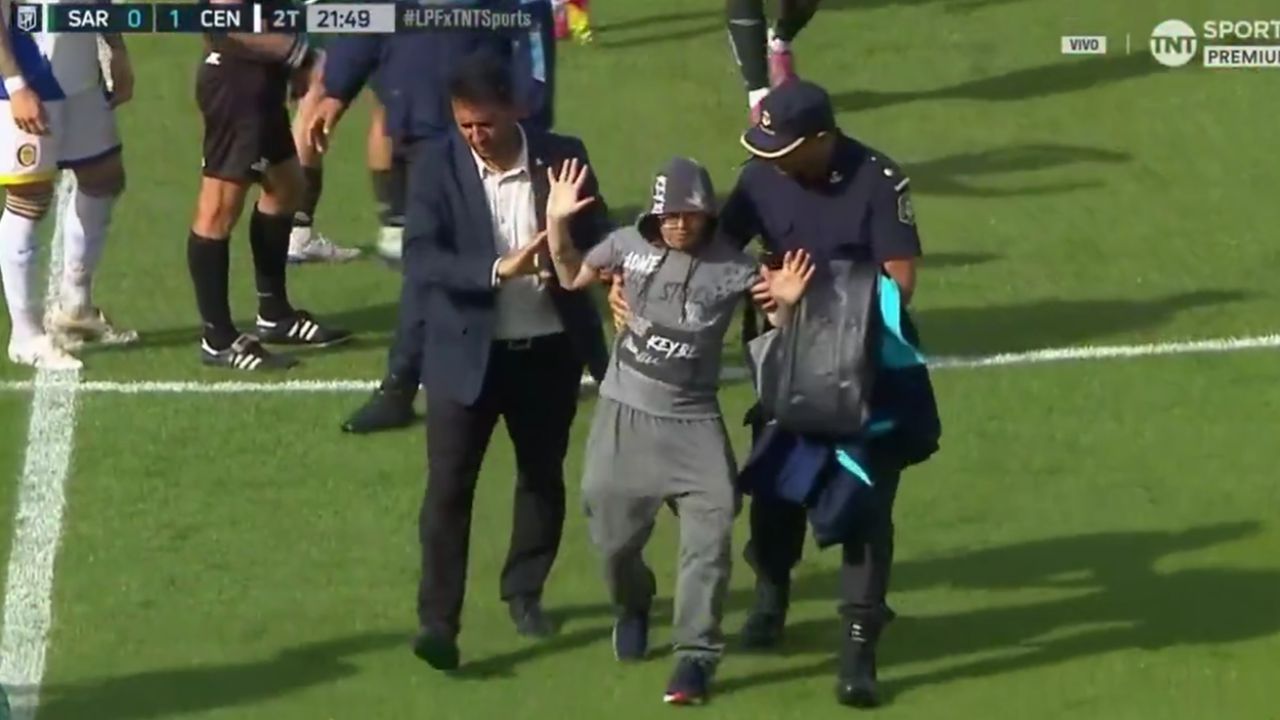 El hincha levantó las manos para mostrar que no estaba armado y fue retirado del campo de juego por un efectivo policial, quien lo condujo con los brazos hacia atrás hasta sacarlo de la cancha.