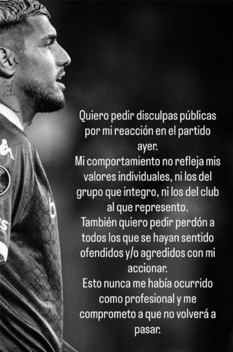 En la misma publicación, agregó: “Quiero pedir disculpas públicas por mi reacción en el partido de ayer. También quiero pedir perdón a todos los que se hayan sentido ofendidos y/o agredidos con mi accionar. Esto nunca me había ocurrido como profesional y me comprometo a que no volverá a pasar”.