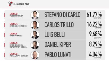 En unas elecciones históricas, con la participación de 25.500 votantes, Di Carlo -representante de “Filosofía River”, obtuvo el 61,77 por ciento de los sufragios, seguido por Carlos Trillo (16,22); Luis Belli (9,68); Daniel Kiper (8,29) y el ex árbitro Pablo Lunati (4), un juez que se "cansó" de favorecer a River en sus tiempos de silbato.