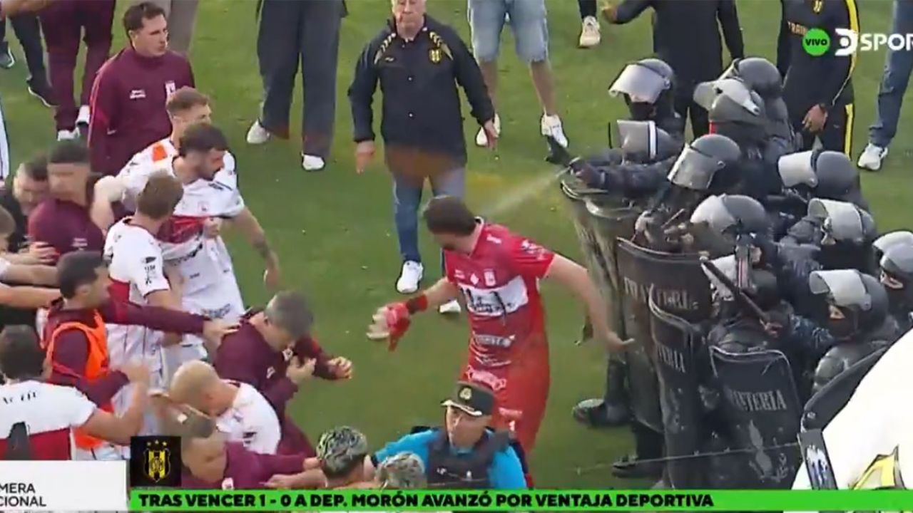 Jugadores de Morón la daban patadas a los escudos de protección de la Guardia de Infantería, que respondió lanzándoles gas pimienta a los futbolistas.