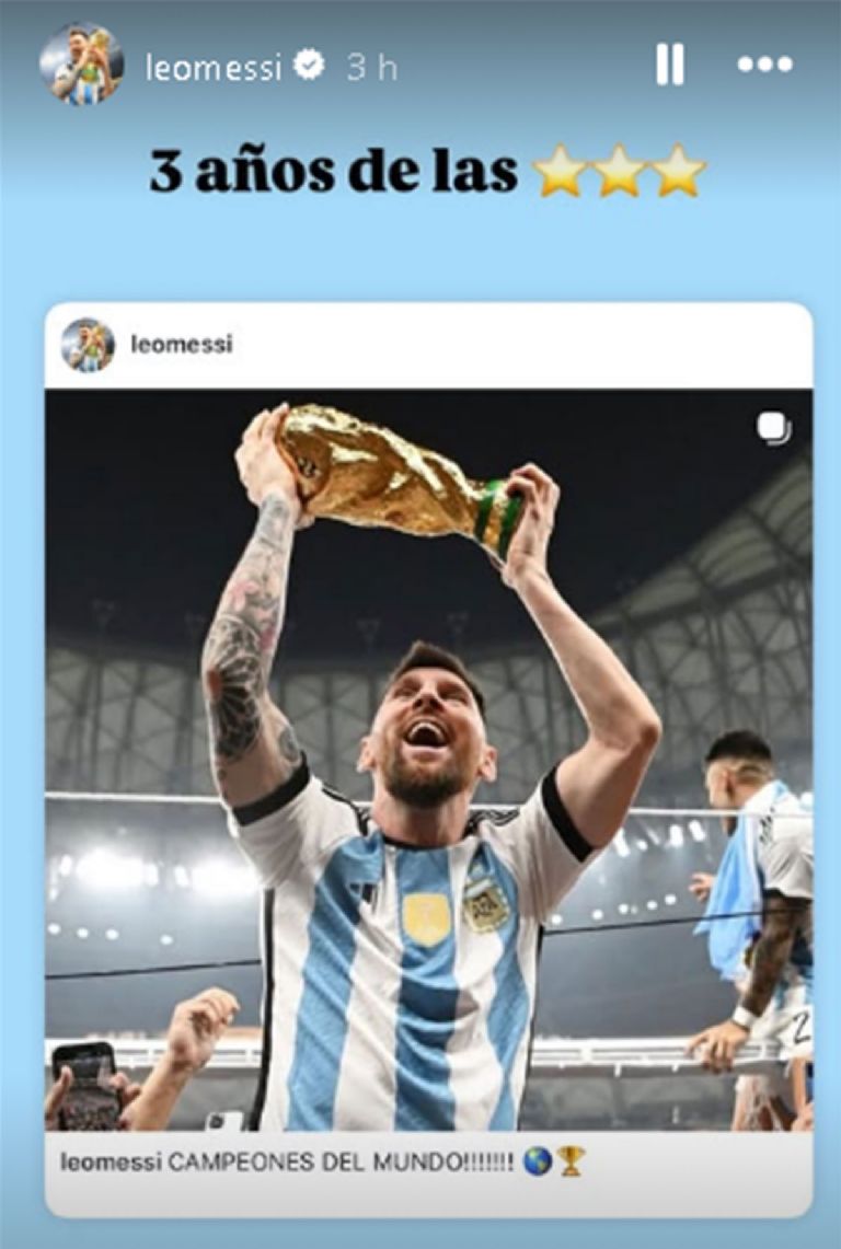 Lionel Messi compartió .una historia de Instagram por los tres años de la Selección argentina en el Mundial de Qatar 2022.