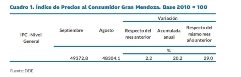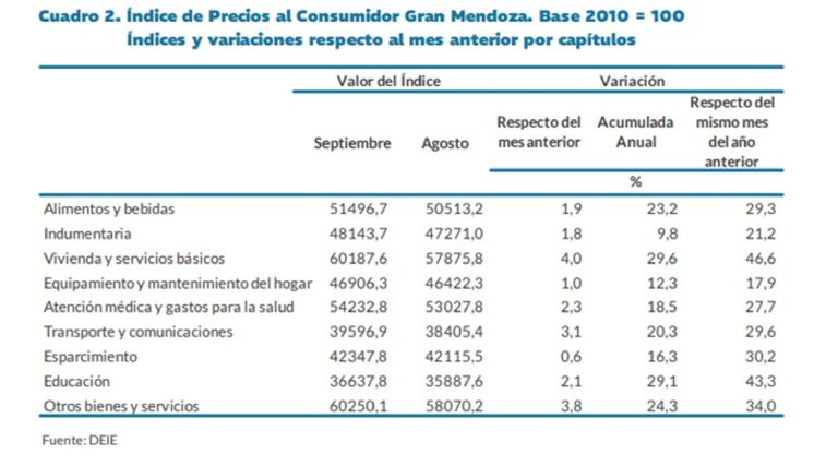En Mendoza el Índice de Precios al Consumidor para septiembre fue de 2,2% y los rubros en los que más se incrementaron los precios fueron: Vivienda y servicios básicos (4%), Otros bienes y servicios (3,8%) y Transporte y comunicaciones (3,1%).