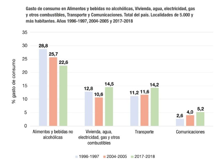 El estudio muestra cómo evolucionaron los hábitos de consumo en las últimas dos décadas. En 1996-1997 los alimentos concentraban el 28,8% del gasto total, mientras que en la última encuesta bajaron al 22,7%. En el mismo período, transporte pasó del 11,2% al 14,2%, y comunicaciones del 2,6% al 5,2%, reflejando el peso creciente de la tecnología y la conectividad en la vida cotidiana.