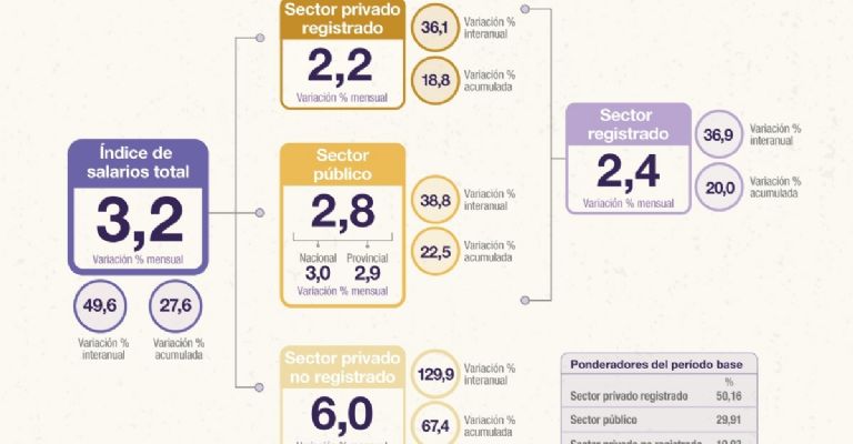 Mientras que el interanual fue consecuencia del incremento en el sector privado no registrado (129,9%), sector público (38,8%) y sector privado registrado (36,1%). Con respecto a los salarios del sector público nacional y provincial subieron en agosto 3% y 2,9%, respectivamente.