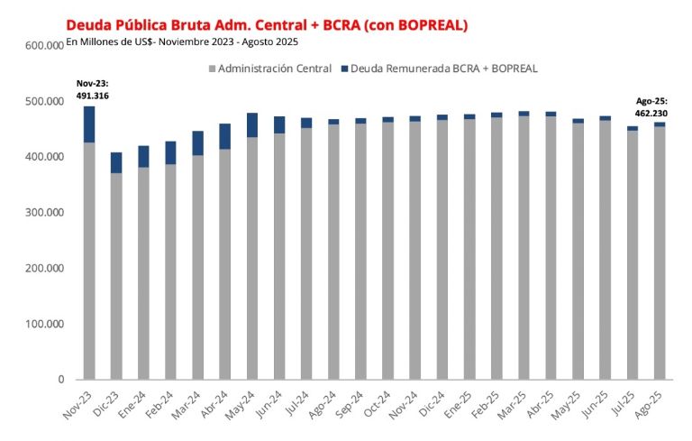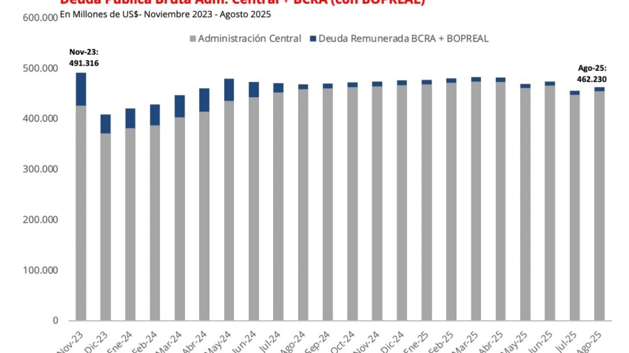 El cálculo de Libertad y Progreso indica que entre noviembre de 2023 y agosto de 2025 el pasivo nacional descendió en casi 30 mil millones de dólares. Ese número, subrayan, desmiente la percepción de que el Gobierno incrementó el endeudamiento para cubrir el déficit.