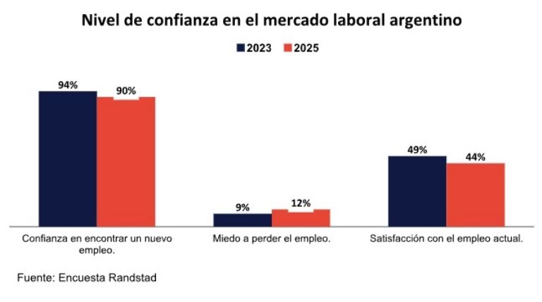 El estudio también reveló una caída en el nivel de satisfacción laboral. Solo el 44% de los argentinos se declara satisfecho o muy satisfecho con su empleo actual, cinco puntos por debajo del nivel registrado en 2023. A nivel regional, el país quedó detrás de Chile (55%) y Uruguay (48%).