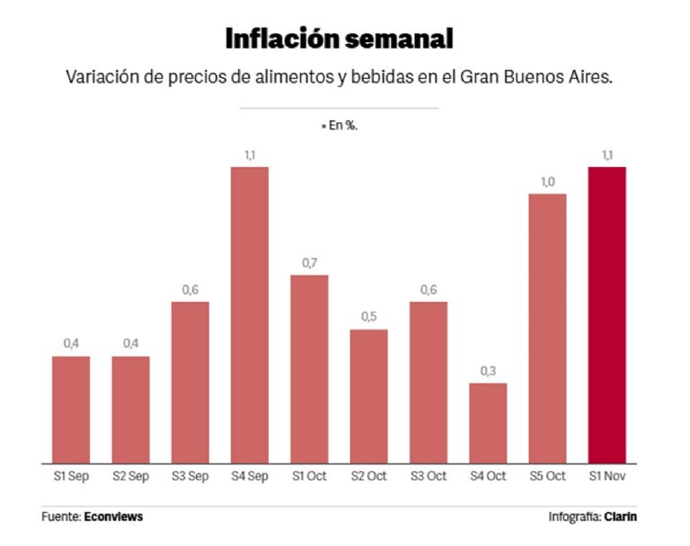 Distintas consultoras hicieron públicas sus primeras estimaciones de aumentos de precios de los primeros días de noviembre. Analytica, por ejemplo, registró un 0,9% de subas semanales en alimentos y bebidas en el Gran Buenos Aires.