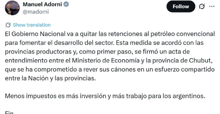 Actualmente, los derechos de exportación (DEX) del petróleo convencional pueden llegar hasta 8% cuando el precio internacional superaba los US$60 por barril. “Menos impuestos es más inversión y más trabajo para los argentinos. Fin”, concluyó Adorni.