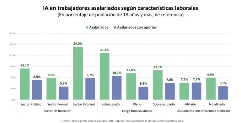 Al puntualizar en la afectación de los problemas alimentarios para los empleados formales asegura que eso “refleja un problema que trasciende la mera inserción laboral”, aunque reconoce que “los trabajadores sin aportes a la seguridad social presentan niveles de inseguridad alimentaria notablemente superiores en comparación con aquellos con aportes”.