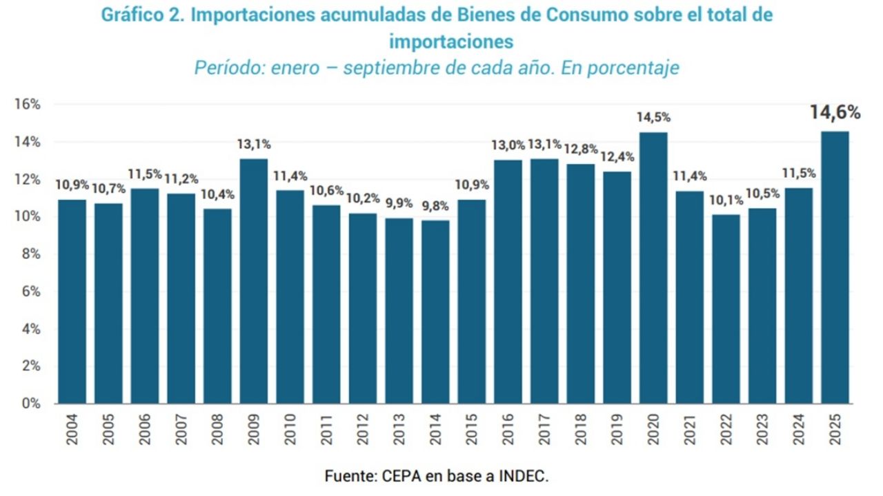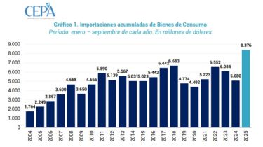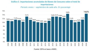 El estudio del CEPA señala que en septiembre de 2025, por tercer mes consecutivo, las importaciones de Bienes de Consumo marcaron un nuevo máximo histórico. Totalizaron 1.157 millones de dólares, mientras que en el acumulado enero-septiembre alcanzaron 8.376 millones de dólares, el valor más alto de la serie con origen en 2004. Este monto supera en 1.693 millones de dólares el récord previo, registrado en el mismo período de 2018, lo que implica un incremento del 25,3%. En términos relativos, las importaciones de Bienes de Consumo representan el 14,6% del total de importaciones de bienes en 2025, ubicándose 4,1 puntos porcentuales por encima del mismo período de 2023.