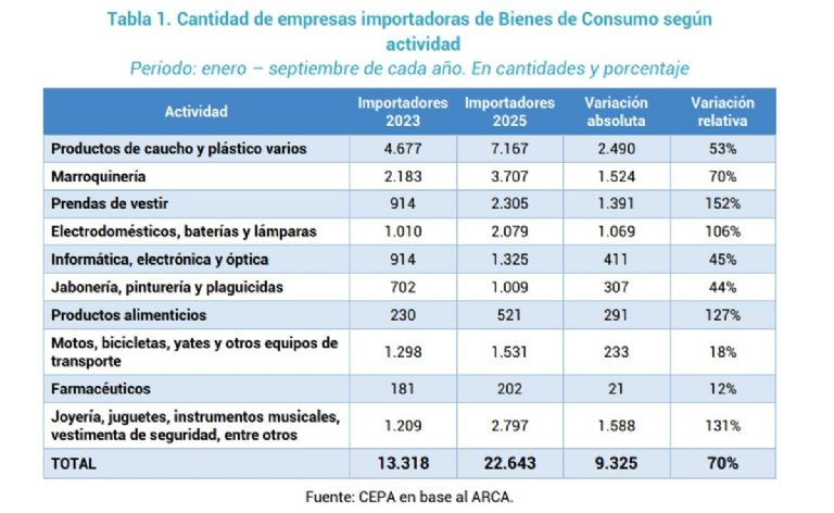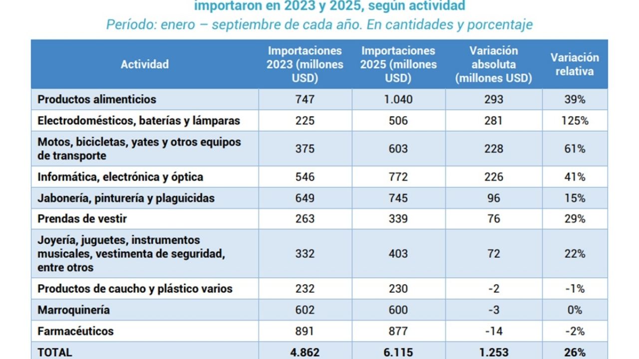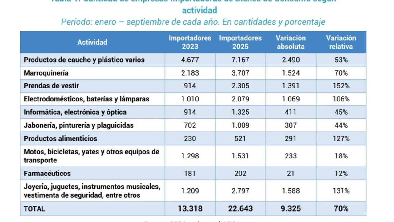 Indican que durante los primeros nueve meses de 2025, las importaciones de Bienes de Consumo registraron un crecimiento muy significativo en comparación con igual período de 2023. El aumento no sólo se refleja en los montos en dólares, sino también en la cantidad de empresas que comenzaron a importar productos que antes no traían del exterior. Según los datos de ARCA para el período enero-septiembre, se observan rubros que multiplicaron por diez, por veinte e incluso por cincuenta su nivel de importaciones respecto del mismo período de 2023.