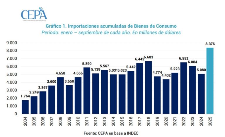 Lo concreto es que en septiembre de 2025, por tercer mes consecutivo, las importaciones de Bienes de Consumo marcaron un nuevo máximo histórico. Totalizaron 1.157 millones de dólares, mientras que en el acumulado enero-septiembre alcanzaron 8.376 millones de dólares, el valor más alto de la serie con origen en 2004.