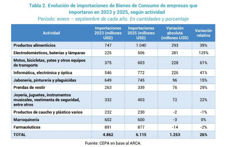Por otra parte, cuando el CEPA analiza las empresas que ya realizaban importaciones en 2023 y continuaron haciéndolo en 2025, se observa que en ciertos sectores el aumento de las importaciones fue notable. En el rubro de Productos alimenticios, estas compañías incrementaron sus importaciones en 293 millones de dólares, lo que representa un alza del 39% respecto al 2023. Les siguen los sectores de Electrodomésticos, baterías y lámparas, con un aumento de 281 millones de dólares (+125%), Motos, bicicletas, yates y otros equipos de transporte con 228 millones de dólares adicionales (+61%) e Informática, electrónica y óptica con un incremento de 226 millones de dólares (+41%).