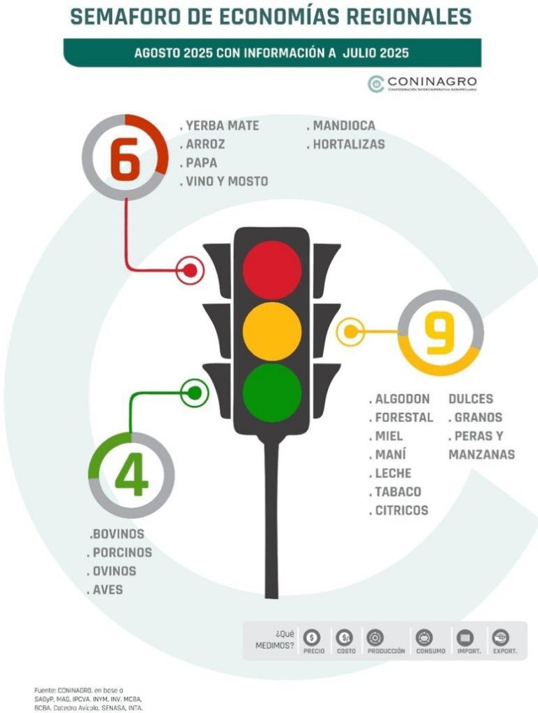 Más allá del caso del vino, el semáforo de Coninagro registró en julio cierta estabilidad en el conjunto de las economías regionales. En total, se contabilizaron 4 actividades en verde, 9 en amarillo y 6 en rojo, sin cambios respecto del mes anterior.