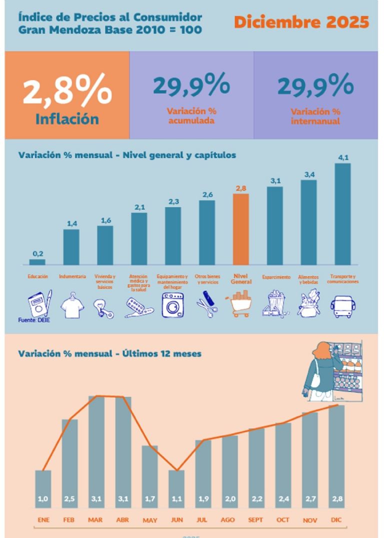 En Mendoza el IPC fue igual que el nacional, de 2,8% y la anual de 29,9%. Los rubros que más aumentaron fueron: Transporte y comunicaciones, alimentos y bebidas, bienes y servicios, equipamiento y mantenimiento del hogar y salud. La suba del boleto dispuesta por el Gobierno se sintió en el Índice de Precios al Consumidor.