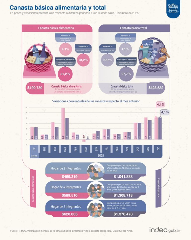 En tanto, la canasta alimentaria, que sirve para estima la indigencia, también se elevó 4,1% y acumuló un alza del 31% en el 2025.