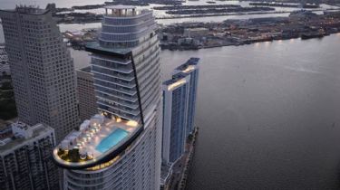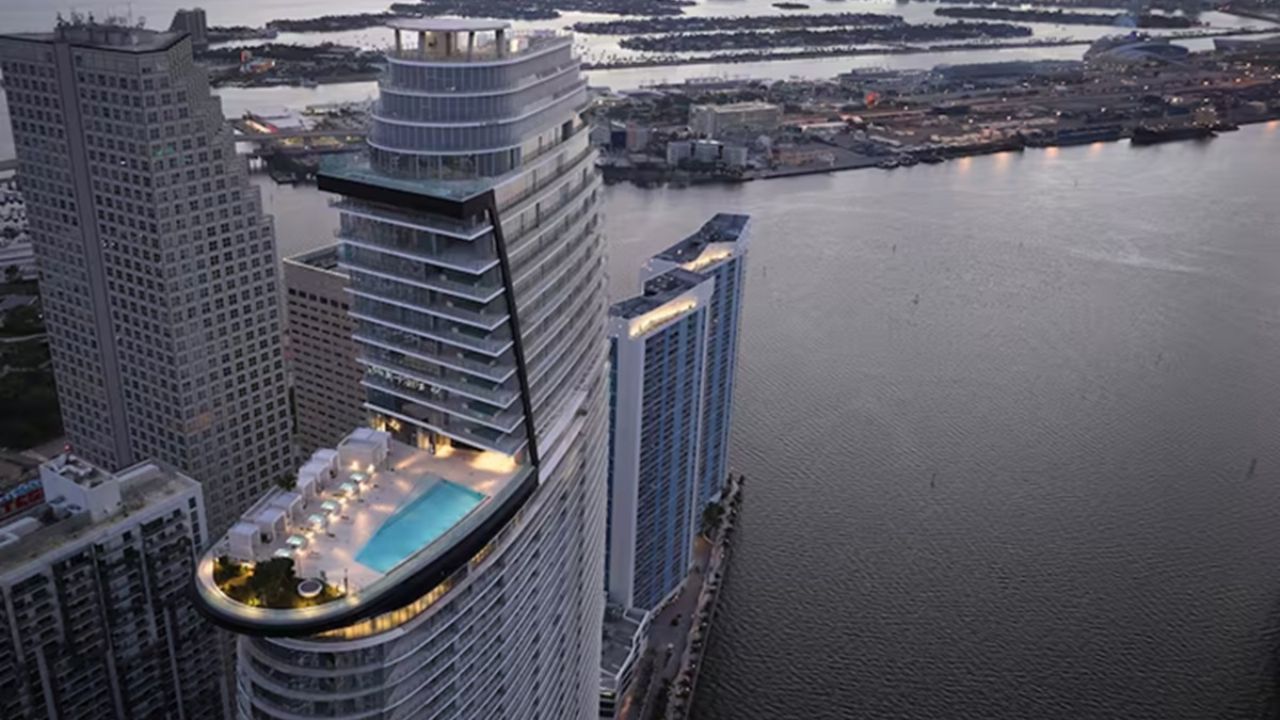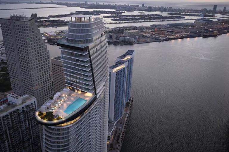 La estructura del rascacielos se refleja en el entorno del puerto deportivo y los 391 propietarios o inquilinos tienen vistas impresionantes de la Bahía Biscayne, del río Miami y de la ciudad.