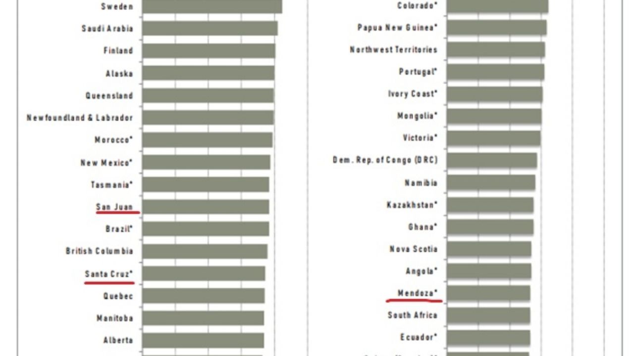 En atractivo de inversiones figura en el puesto 77, en Indice de Percepción Política en el lugar 55 y en el 34 en cuanto potencial minero.