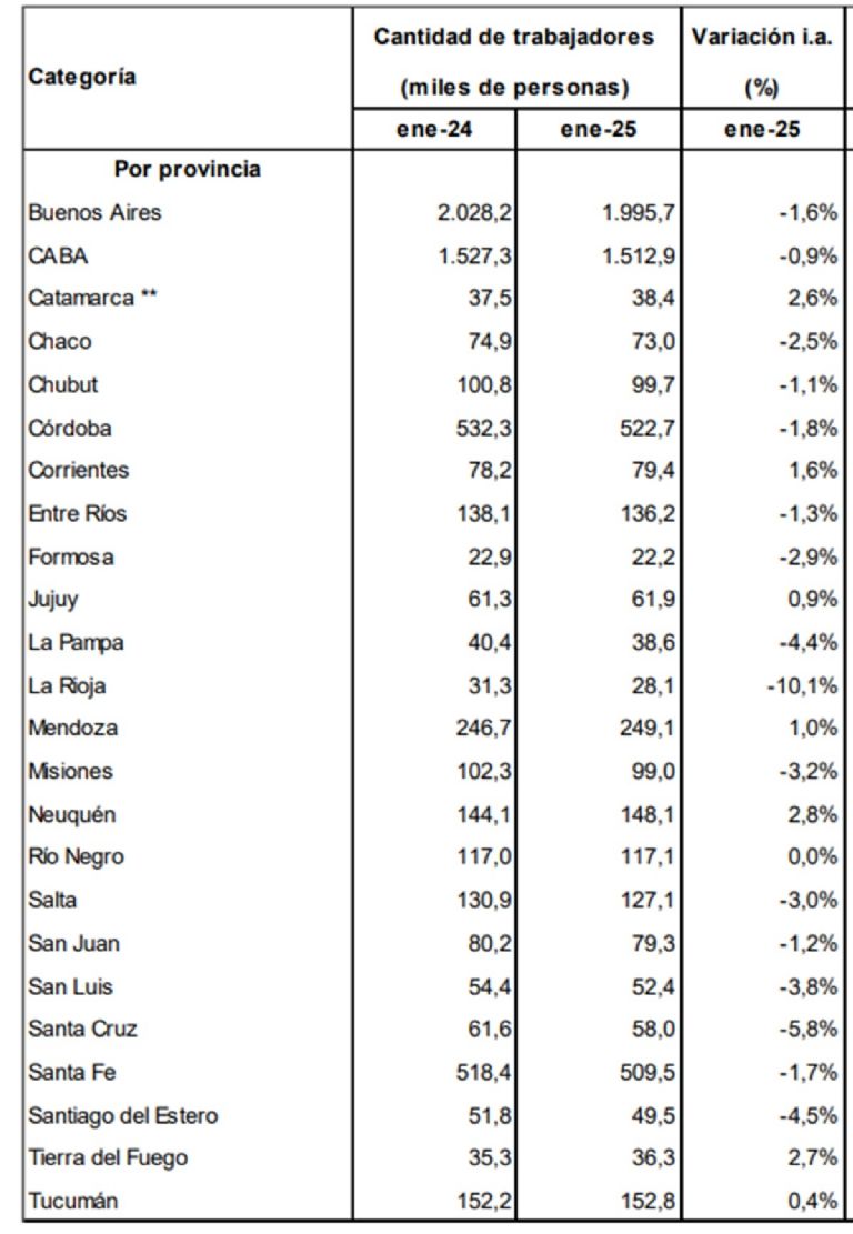 Entre enero del 2025 y el mismo mes del 2026 Mendoza perdió 6.300 empleos formales según el Sistema Integrado Previsional Argentino (SIPA). En enero del año pasado la provincia tenía 249.100 trabajadores formales y en enero de este año la cifra bajó a 243.200, bajó 2,5%.