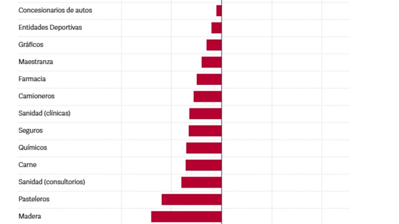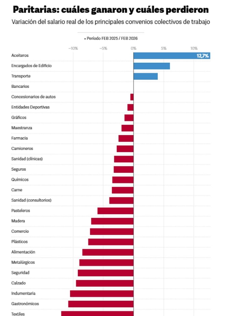 "En contraste, otros convenios -como Bancarios, Concesionarios de autos, Entidades deportivas y Gráficos- exhiben estancamiento o caídas acotadas, ubicándose en torno a valores cercanos a cero o levemente negativos", mencionó por otra parte el informe oficial.
