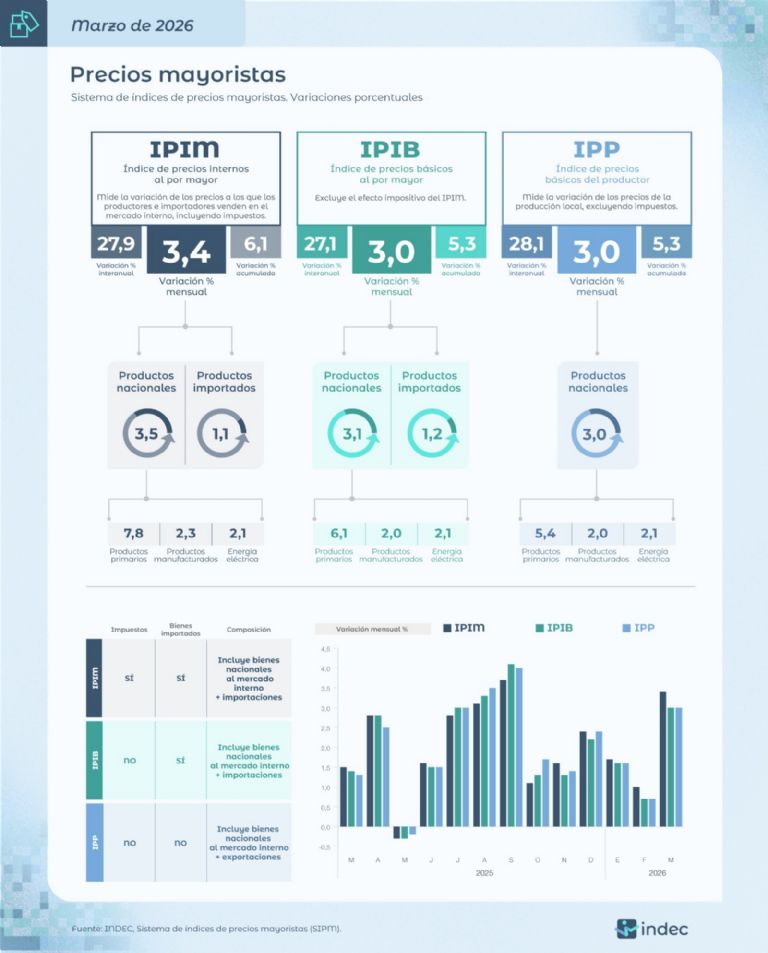 Por otro lado, el nivel general del índice de precios internos básicos al por mayor (IPIB) mostró un ascenso del 3% contra febrero, explicado por la suba de 3,1% en los productos nacionales y de 1,2% en los importados.