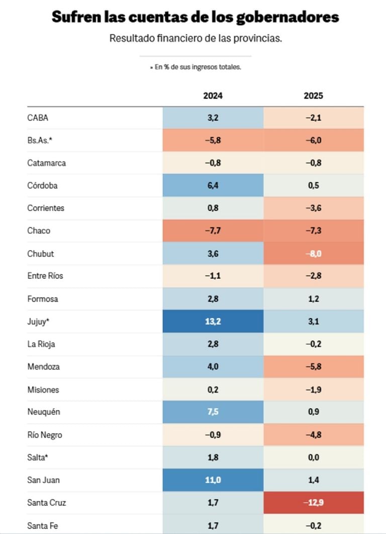 Las que pudieron manterse con superávit fueron Córdoba, Formosa, Jujuy, Neuquén, San Juan, Santiago del Estero y Tucumán. Incluso ellas también tuvieron un deterioro: en todos los casos el excedente fiscal con el que cerraron 2025 fue más bajo que el que tenían un año antes.