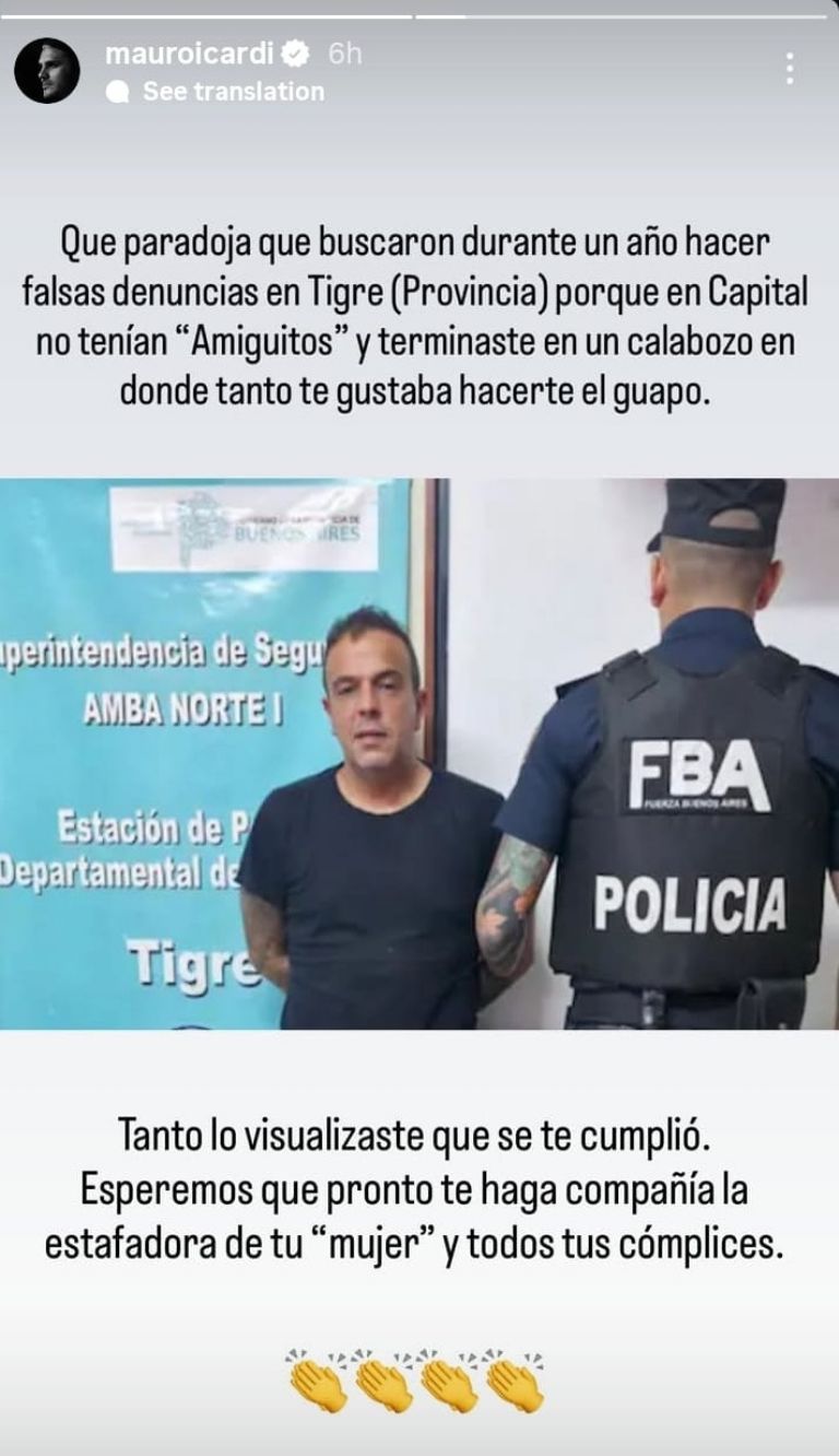 Este jueves el polémico abogado Nicolás Payarolafue detenido en el marco de una investigación por estafas. Luego de que se conociera la noticia, Mauro Icardise pronunció en sus redes sociales y dejó un fuerte mensaje a su ex esposa.