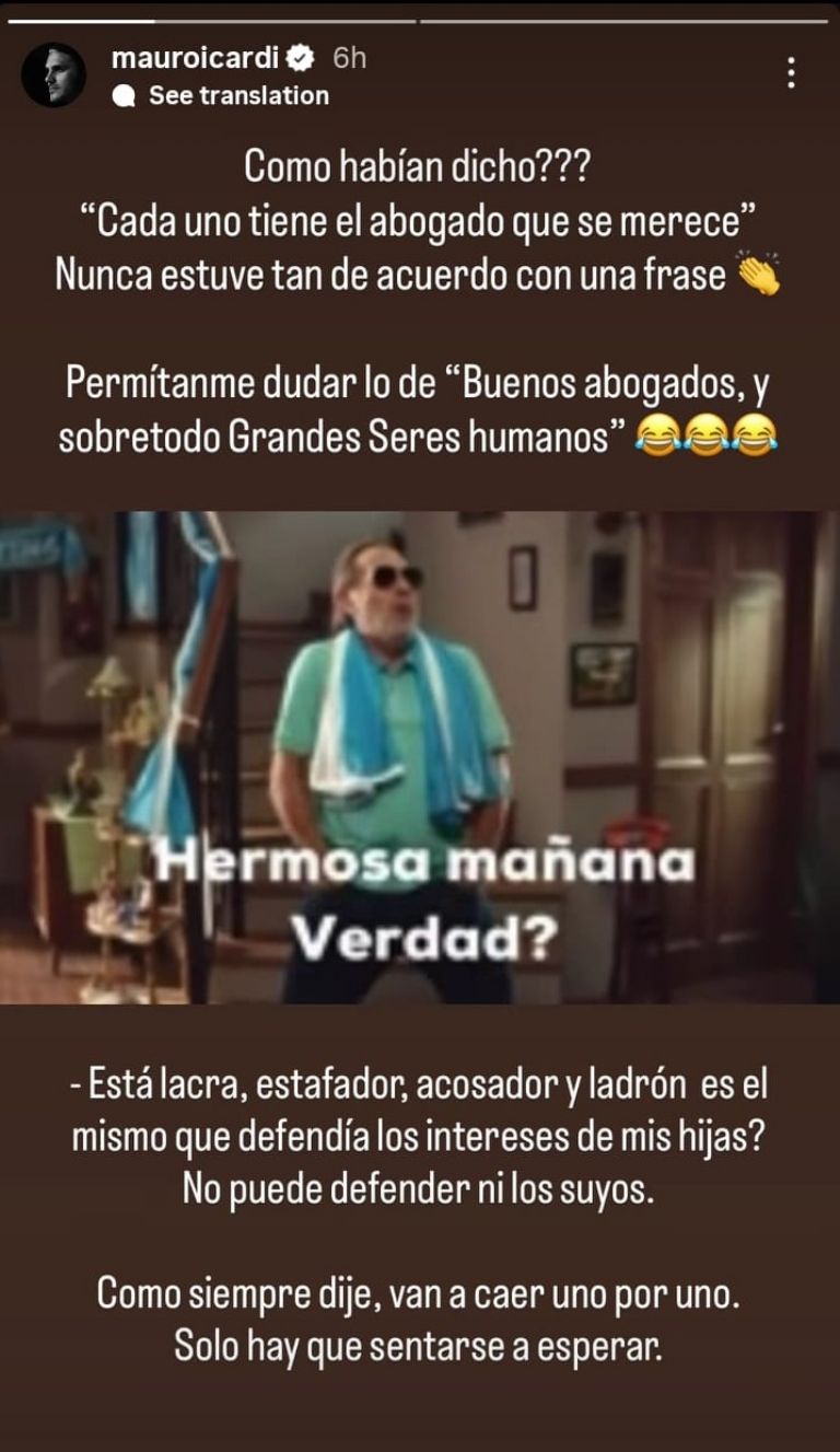 "¿Cómo habían dicho? ´cada uno tiene el abogado que se merece´. Nunca estuve tan de acuerdo con una frase- Permítanme dudar de lo que ´buenos abogados sobre todo grandes seres humanos´", escribió en sus historia de Instagram el ex deWanda Nara.