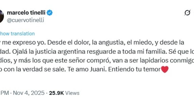 A través de sus redes sociales, Marcelo Tinelli se refirió a la fuerte denuncia que hizo su hija Juanita Tinelli, quien aseguró que había recibido amenazas de muerte contra su persona y el resto de la familia.