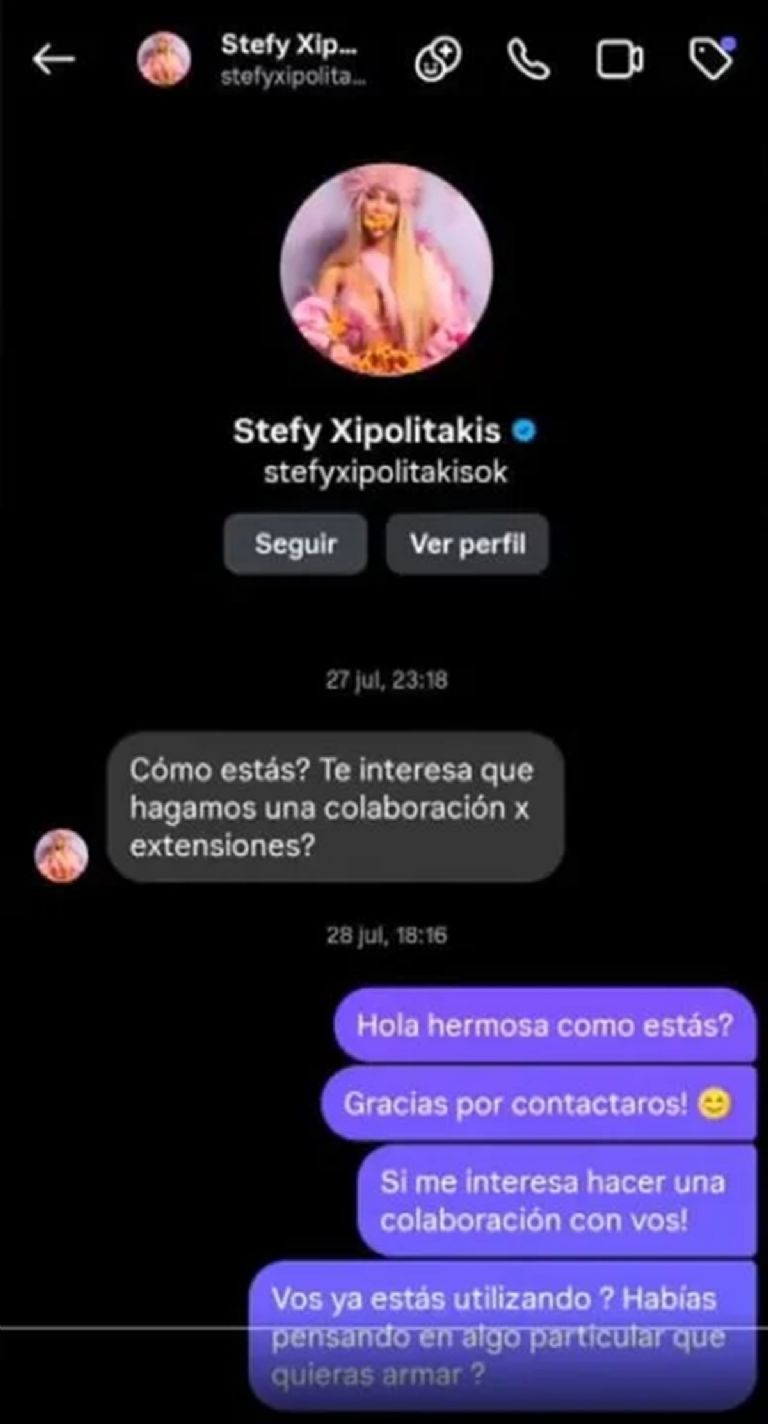 La respuesta por parte de la peluquería no tardó en llegar: “Hola hermosa ¿cómo estás?¡Gracias por contactarnos! Sí, me interesa hacer una colaboración con vos ¿Vos ya estás utilizando? ¿Habías pensado en algo particular que quieras armar?”.