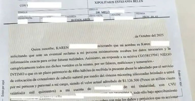 “Intimo a que en un plazo perentorio de 48 horas hábiles de recibida la presente abone la deuda por el servicio de colocación de extensiones de cabello por medio del sistema microring siliconadas brindado a usted por mi persona y personal a mi cargo, con un valor actual adeudado de $1.126.500 (Pesos un millón ciento veintiséis mil quinientos) a mi cuenta de mi titularidad”, continúa el escrito.