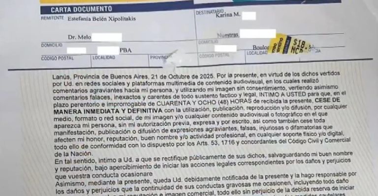 “Intimo a usted para que, en el plazo perentorio e improrrogable de 48 horas de recibida la presente, cese de manera inmediata y definitiva con la utilización, publicación, reproducción y/o difusión, por cualquier medio, formato o red social, de mi imagen y/o cualquier contenido audiovisual o fotográfico en el que aparezca mi persona, sin mi autorización previa, expresa y por escrito”, retrucó.