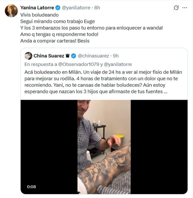 “Vivís boludeando. Seguí mirando como trabajo Euge. Y los 3 embarazos los paso tu entorno para enloquecer a Wanda! Amo q tengas q responderme todo! Anda a comprar carteras! Besis”, cerró Latorre, manteniendo el alto nivel de tensión en el cruce.