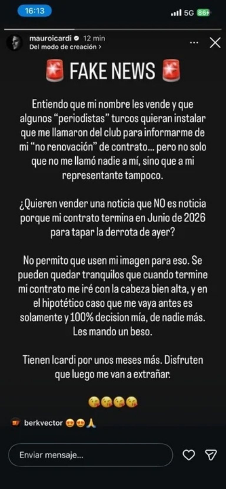 "Entiendo que mi nombre les vende y que algunos ´periodistas´ turcos quieran instalar que me llamaron del club para informarme de mi ´no renovación´ de contrato… pero no solo que no me llamó nadie a mí, sino que a mi representante tampoco", comenzó su descargoMauro Icardien su cuenta de Instagram.